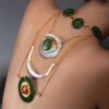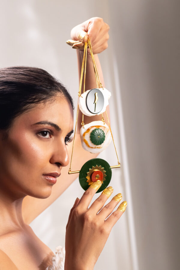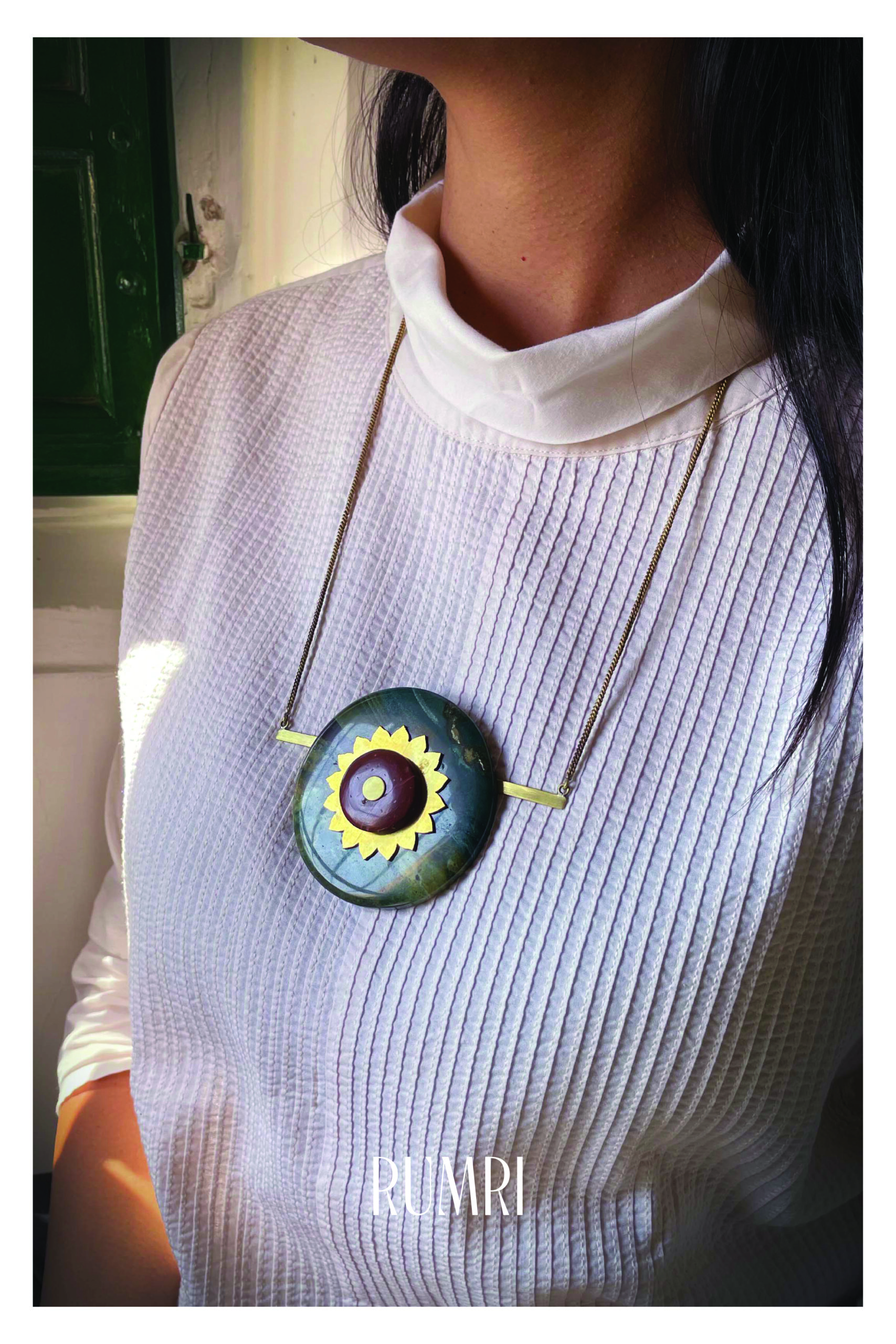 • Description The Chakra necklace is a tribute to the vibrant traditions and festivities people indulge in as part of the Indian culture. The blood stone (forest green) is believed to provide protection against evil spirits and bring good fortune, whereas the red jasper signifies strength and undaunted spirit. The synchrony of these striking colours is like a fabric of the rich history of India’s primordial heritage.
