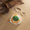 • Description The pendant features layers of agate slabs, each with natural, irregular edges that give the design a raw and organic feel. The agate slates vary in shades, transitioning from smoky greys and creamy whites to soft, translucent hues, showcasing their natural banding and patterns. The layering creates a cascading effect, adding depth and visual interest to the pendant. The green carved Green Jade stone adds elegance to the pendant necklace. The pendant is suspended from a sleek chain, allowing the layers and jade stone to take center stage.