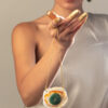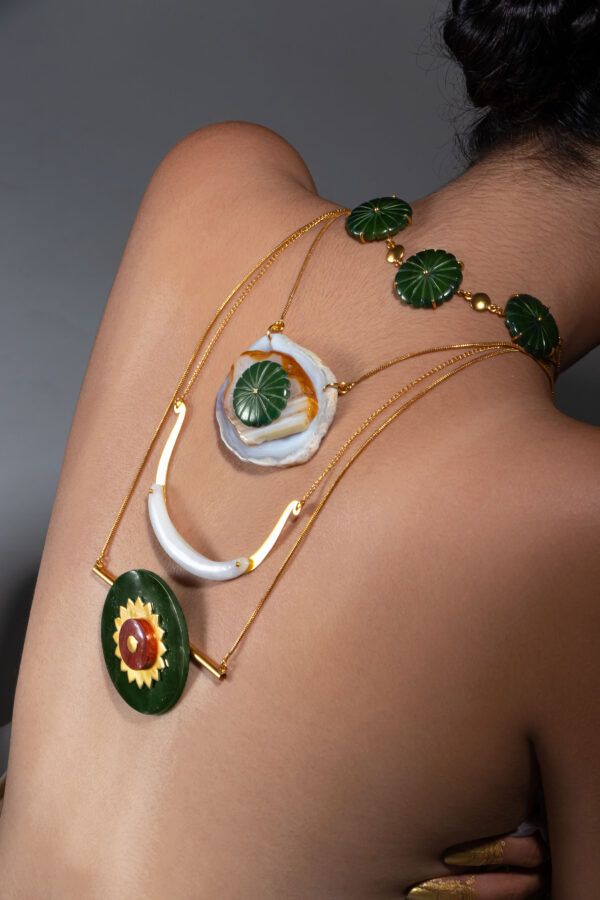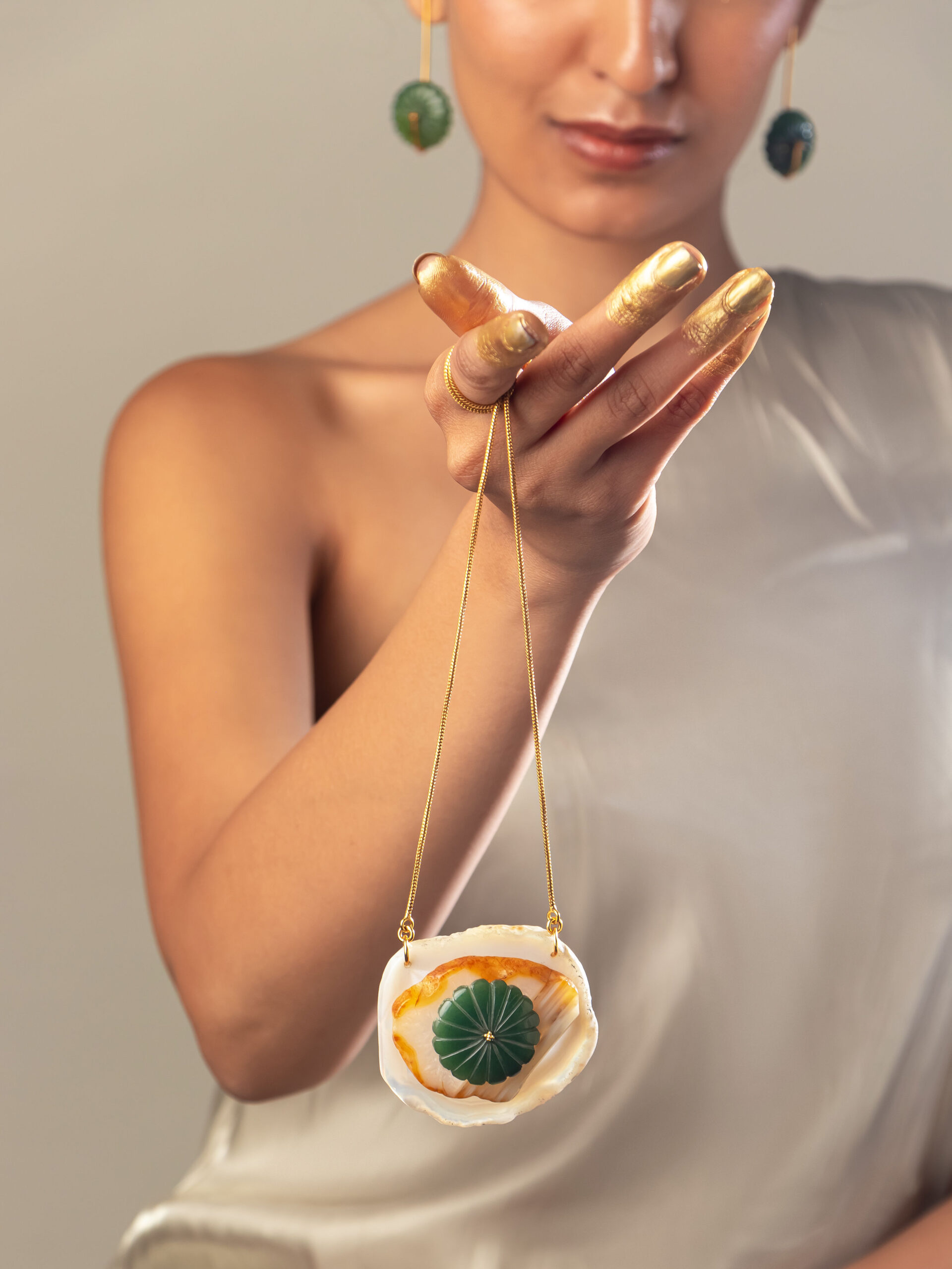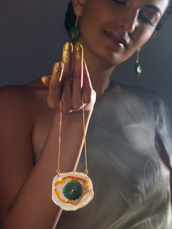 • Material 24K Gold on Brass with Natural Agate slice and Green Jade